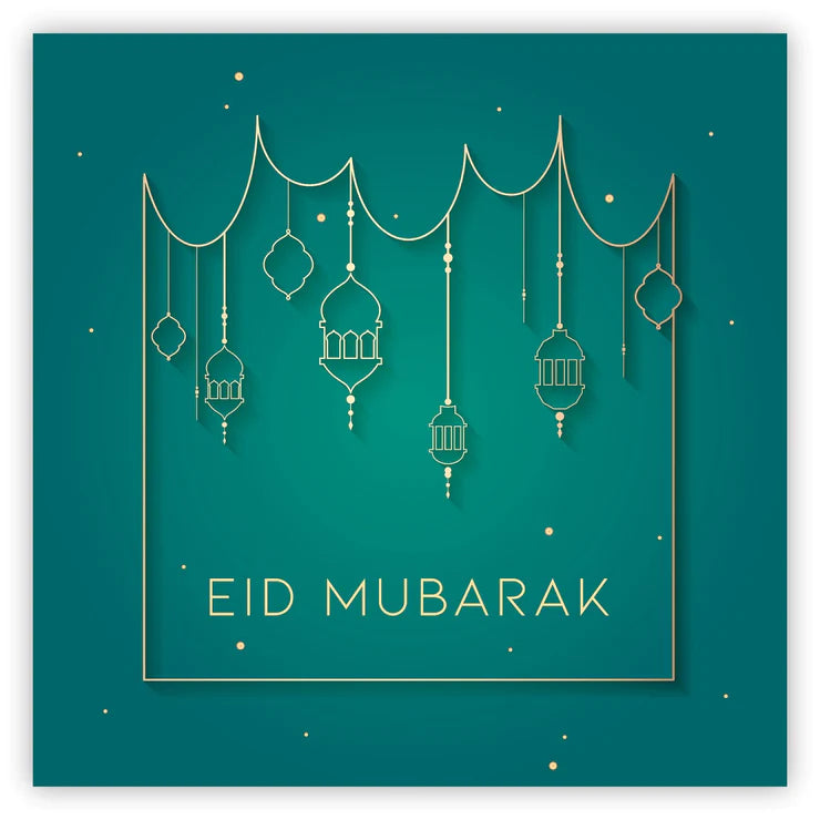 Eid Mubarak Card - Teal & Gold Hanging Lanterns