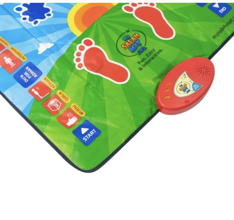 My Salah Mat is a prayer mat designed to educate children on how to perform the Muslim prayer in a fun and enjoyable way. The interactive prayer mat is touch sensitive and has pre-recorded keys that can be touched to reveal the sound, such as prayer times, how to do wudu, recite surahs, say duas, and much more. It can teach about the different times of salah, and the various bodily movements and positions, and what to say during them. In order to make the learning process easy, My Salah Mat will guide the user through two rakat of salah using a simple to understand format.