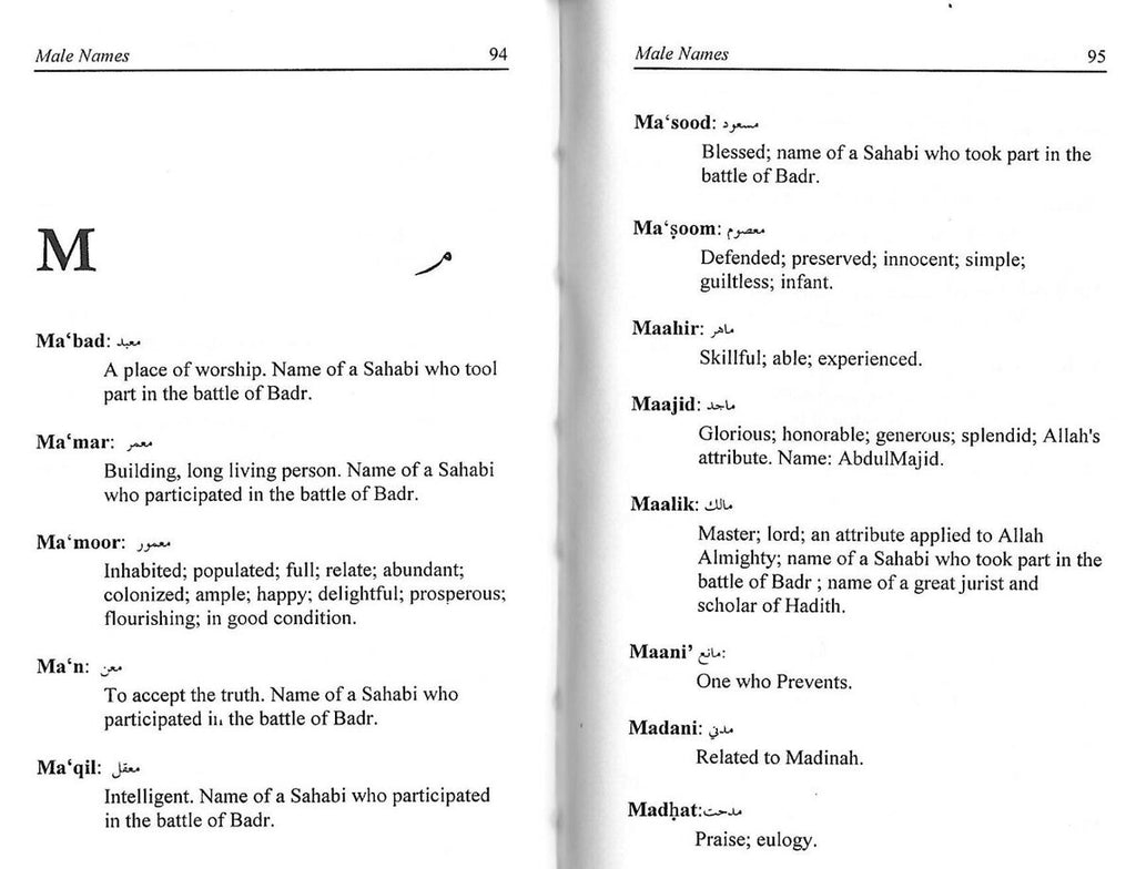 In A-Z format. Contains English transliteration and Arabic transcript of each name. English translation and significance, if any, of each name is also included.