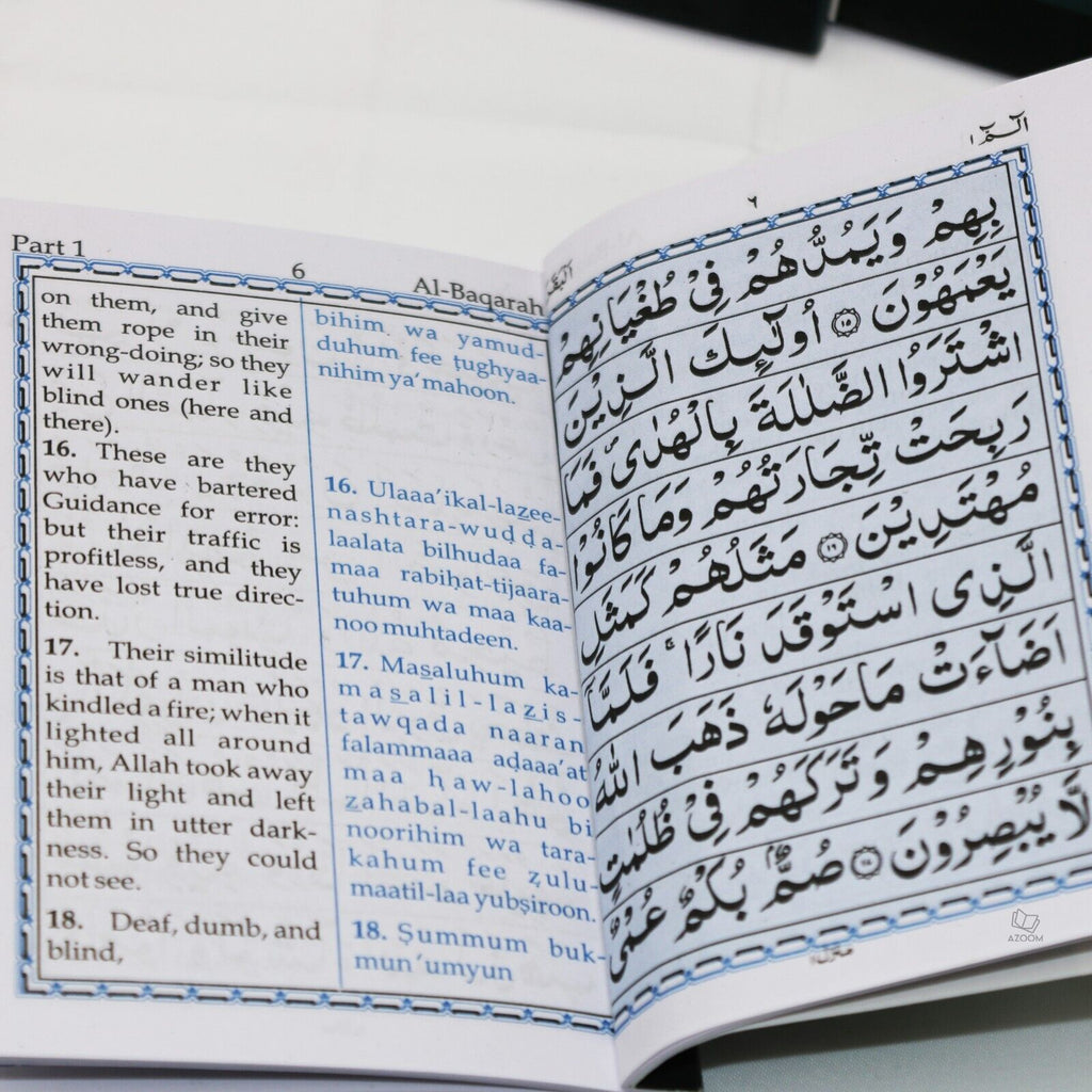 - Arabic text on one page with the English Translation & Roman Script Transliteration on the opposite page.