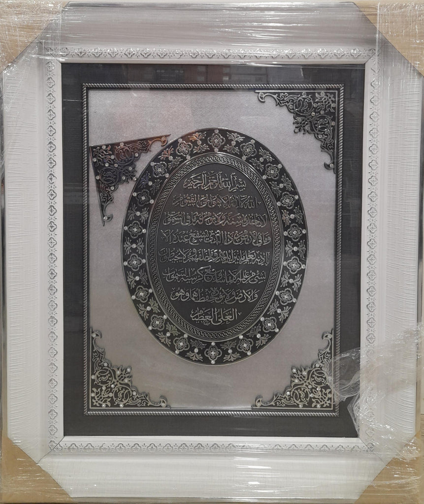 Experience elegance and luxury with our LUXURY AYATUL KURSI DIAMANTE SILVER FRAME. Measuring 54 x 64 cm, this stunning piece is accented with sparkling diamantes and a sleek silver frame, adding a touch of glamour to any space. Enhance your home decor and show your devotion with this premium product.