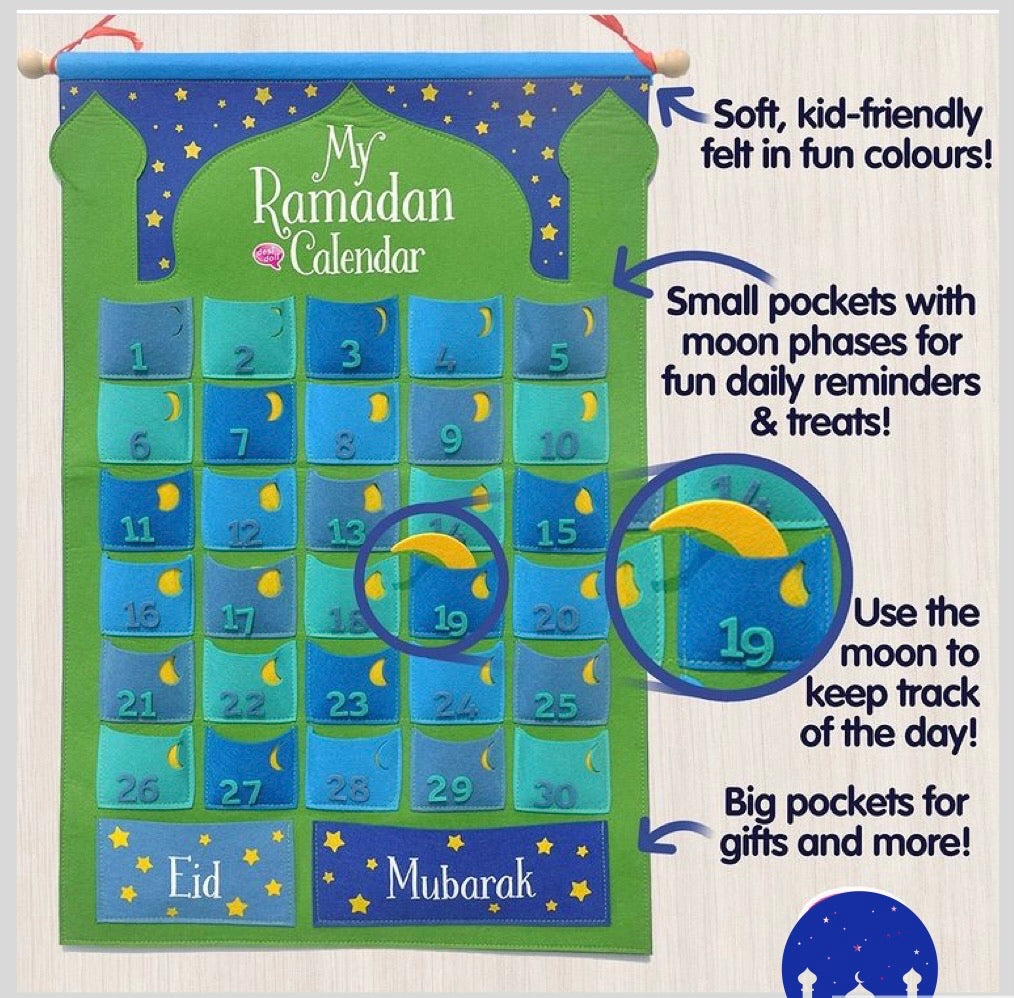 Countdown to Eid with these beautiful handmade fabric Ramadan Calendars. Make each day of Ramadan special for your little ones. Fill the pockets with small treats/sweets and daily Ramadan Reminders! See the different phases of the moon throughout ...